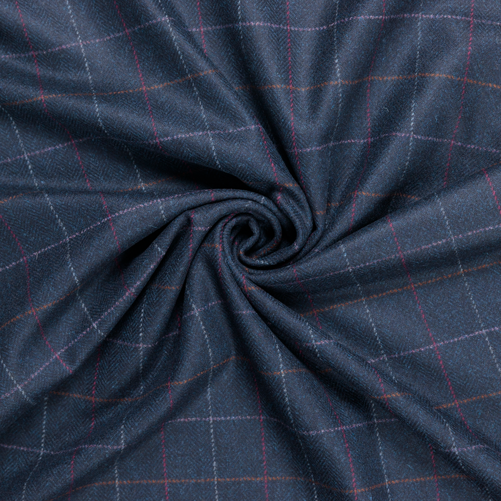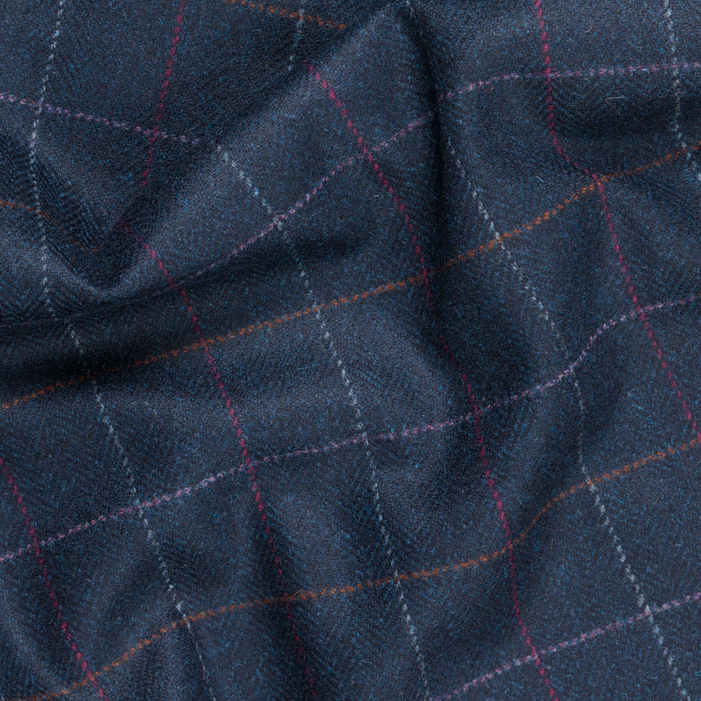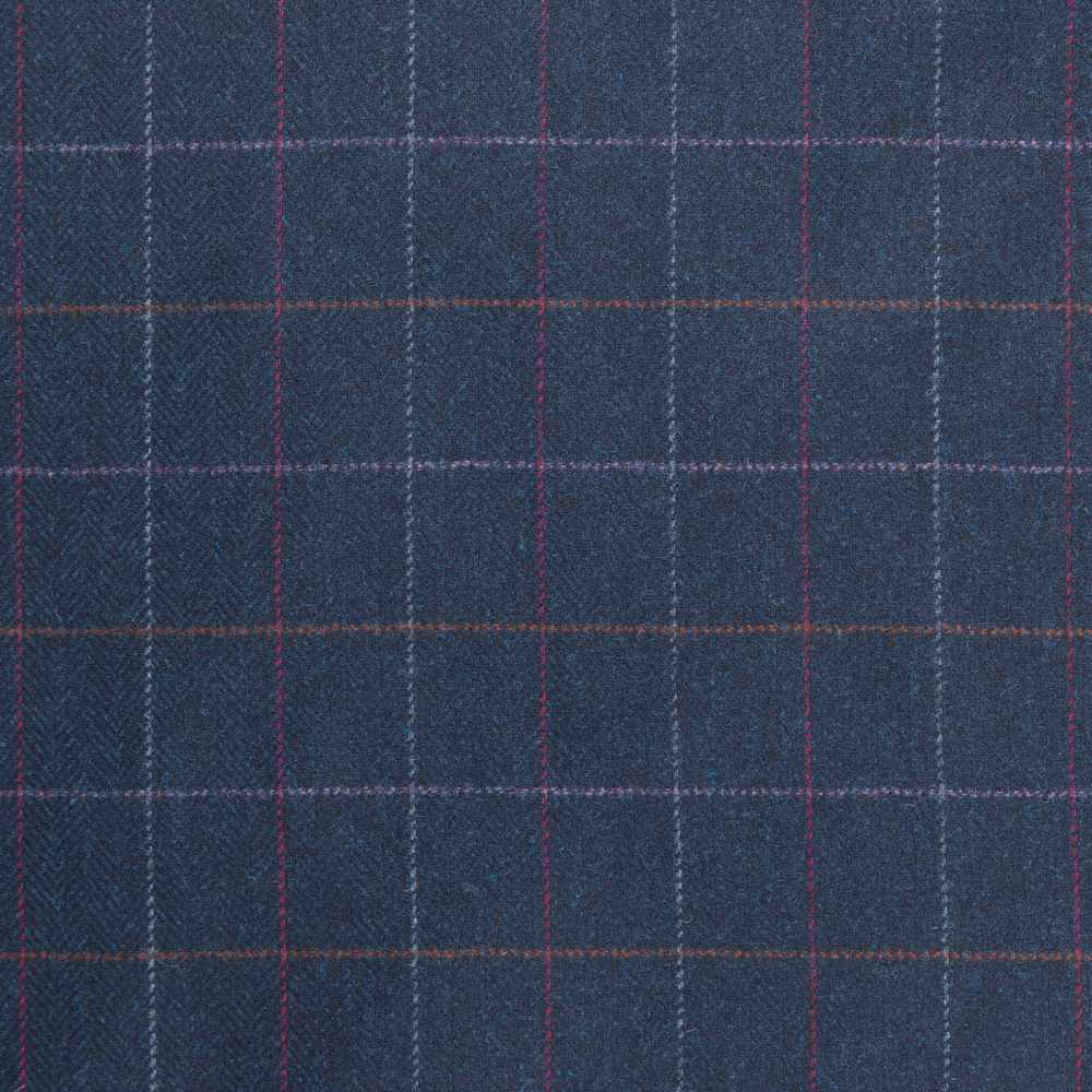 A heritage classic reimagined in rich detail. This 100% lightweight English wool tweed features a refined navy twill base punctuated with subtle flecks of orange and blue. Its striking 2.5" windowpane check in burgundy, pink, mustard, and light blue offers a sophisticated twist on timeless tailoring. With a beautiful soft drape and no stretch, it’s ideal for suiting, blazers, vests, or elevated separates. Opaque and breathable - a lining is optional depending on finish and comfort.