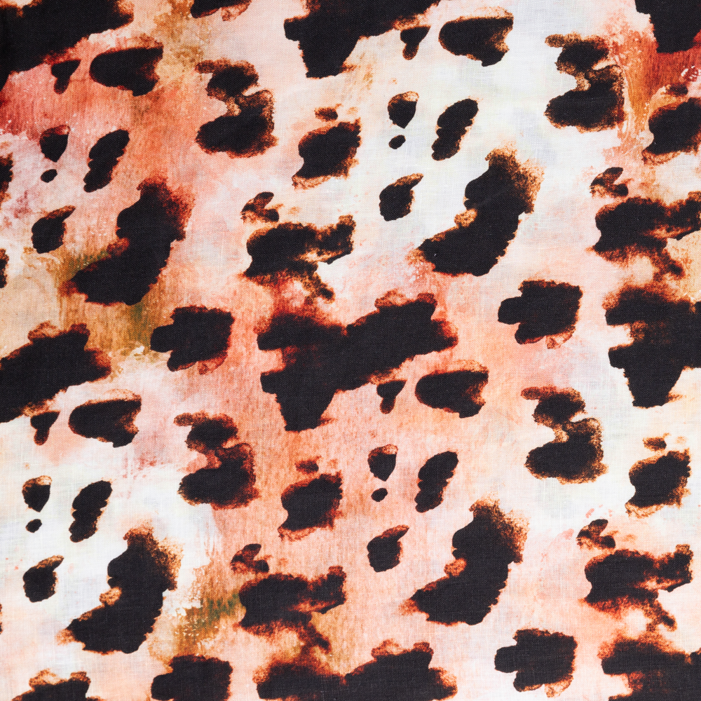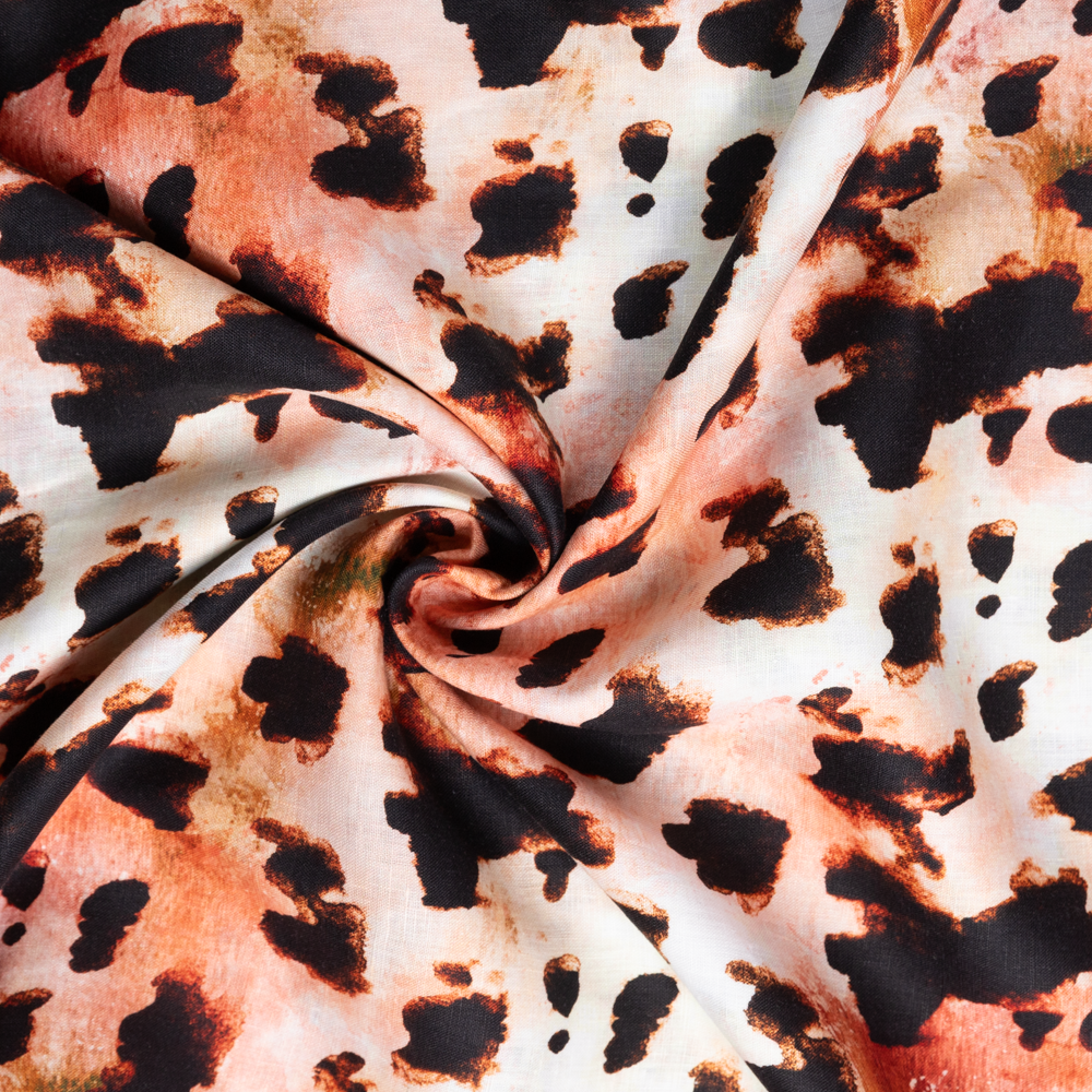 For a splash of colour, take a glance at this 100% Linen Watercolour Ink Splotch Ginger. A light orange tie-dye base is covered with abstract back ink splots. A soft hand partnered with a crisp, woven texture merges with a flexible, semi-billowing drape. Derived from the flax plant then spun into linen fiber, this interesting orange woven is not only breathable but naturally strong too. Lightweight, this fashion fabric is an excellent choice for long and flowing garden-party dresses, mid-length skirts that sit at one's natural waist, roomy t-shirt dresses, as well as countless others. Without stretch, it's best to include extra wearing ease in your designs, and strive for loosely fitted silhouettes. Boasting a transparent construction, a lining fabric such as cotton broadcloth, cotton voile, or china silk will encourage true opacity, add weight, and help prevent seam slippage.