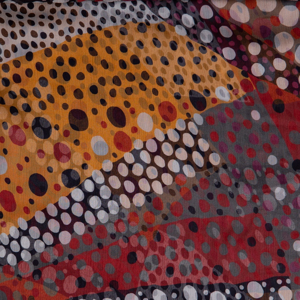 Showing off in warm, autumnaltones, this silky smooth chiffon flaunts a beautiful, effortless drape. Thin and of a featherweight, it’s dyed facing teases a fabulous geometric and African-inspired pattern; its crisp hand and very sheer construction, made possible by tightly twisted crepe yarns. Drape full silhouettes—avoiding those tight-fitted—such as simple bias-cut garments, bountiful blouses, maxi dresses, lavish cover-ups, scarves, and more. Without stretch, it’s best to include extra wearing ease in your designs, too. Gather garments, introduce a built-in slip, or prepare a (separate) lining made from an opaque material for true opacity. To help prevent the fine yarns from unraveling, give french seams a try, or opt to finish straight seams with zig-zag stitches or pinking shears.