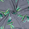 Tropical lime green fronds and idecorate this horizontal black and white striped face. Supersoft and cool in hand with a fluid, lightweight drape, utilize the four-way stretch for leggings, bodysuits, crop tops, or bodycon skirts and dresses. Semi-translucent, a lining is not necessary for most projects.