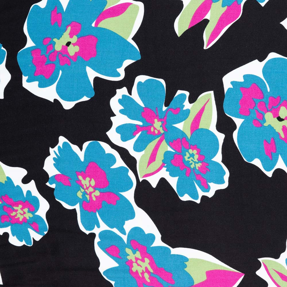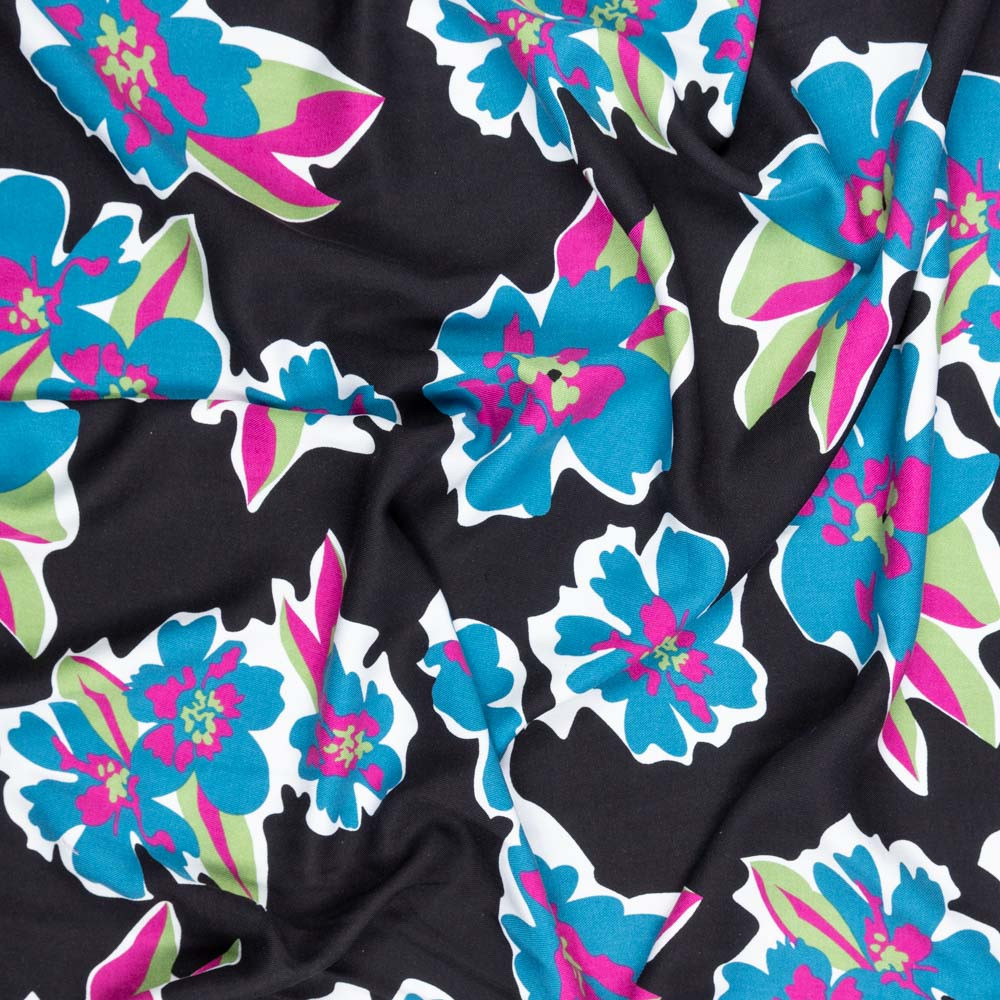 Livia is printed on a stunning slinky drapey twill, this fabric gives a luxurious finish to your garments. It has black background and is covered in a big bright floral design. This fabric is ideal for floaty dresses and trousers.
