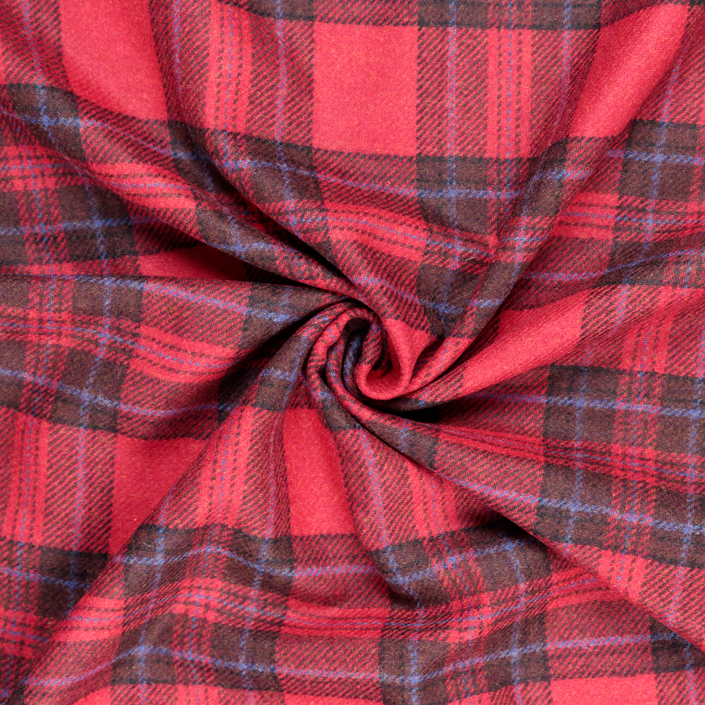 A classic English wool tweed reimagined for 2026, featuring a rich crimson background with cobalt blue stripes intersecting brown and black squares. Midweight yet surprisingly soft for wool, it offers a structured drape perfect for statement coats, tailored jackets, and winter skirts. Nostalgic yet contemporary, this tartan blends 90s charm with modern-season sophistication, making it a standout choice for timeless outerwear and seasonal staples. A lining is recommended for comfort.