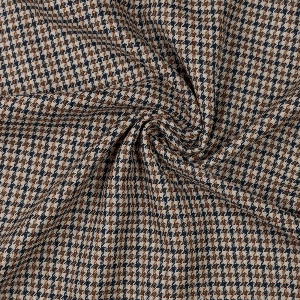 Alternating midnight navy and ochre green stripes crisscross on a cool heathered creamy beige background, forming an elegantly rustic checkered pattern with a soft, fuzzy surface. With a pliable drape, textural hand and no stretch, design blazers, trousers, and vests to dress up your work wardrobe, or whip up cosy button-down winter dresses and pleated skirts! Mostly opaque, a lining isn't necessary but may be desired for added structure, comfort, and a polished finish.