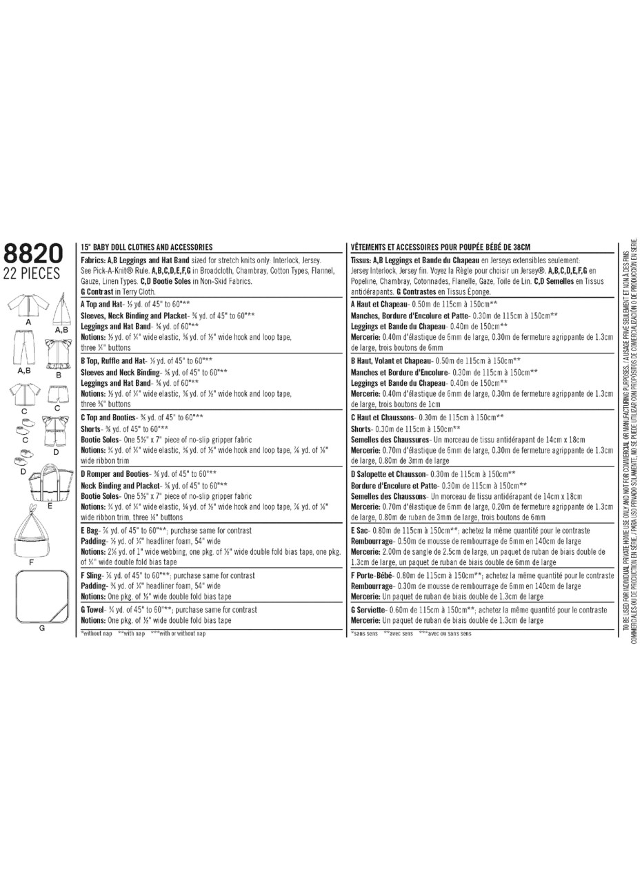 Cute and adorable clothes and accessories for your 15" baby doll. Includes tops, bottoms, romper, hat, booties, bag, sling and blanket. Carla Reiss for Simplicity.