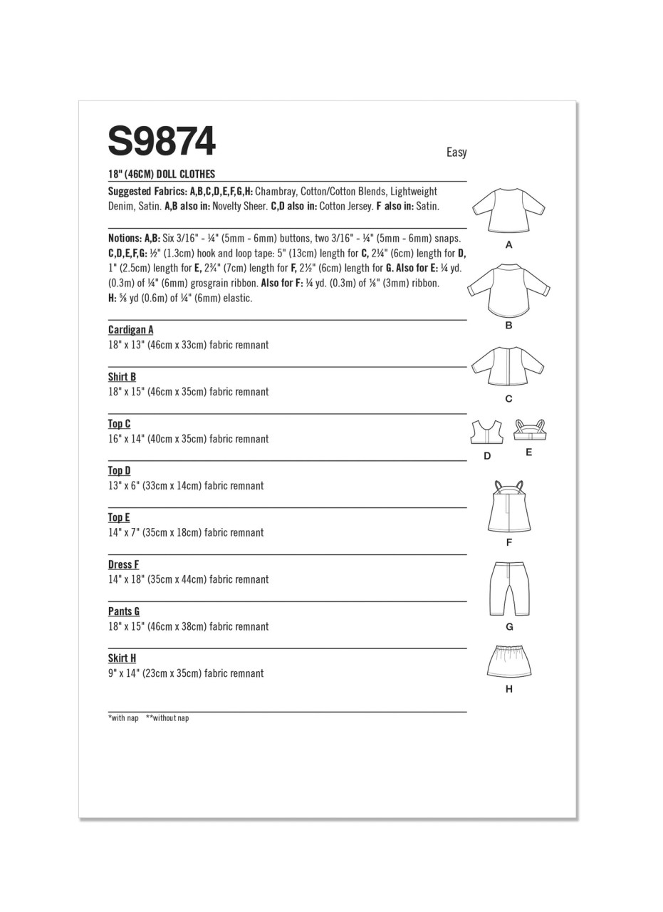 90's look, mix and match pieces for 18" dolls include faux placket cardigan and shirt with snap front closure. Ribbon strap top and dress and pants with stitched details all have back hook and loop tape closure. Faux placket pull on skirt has back elastic.