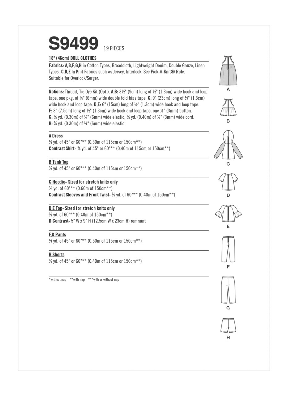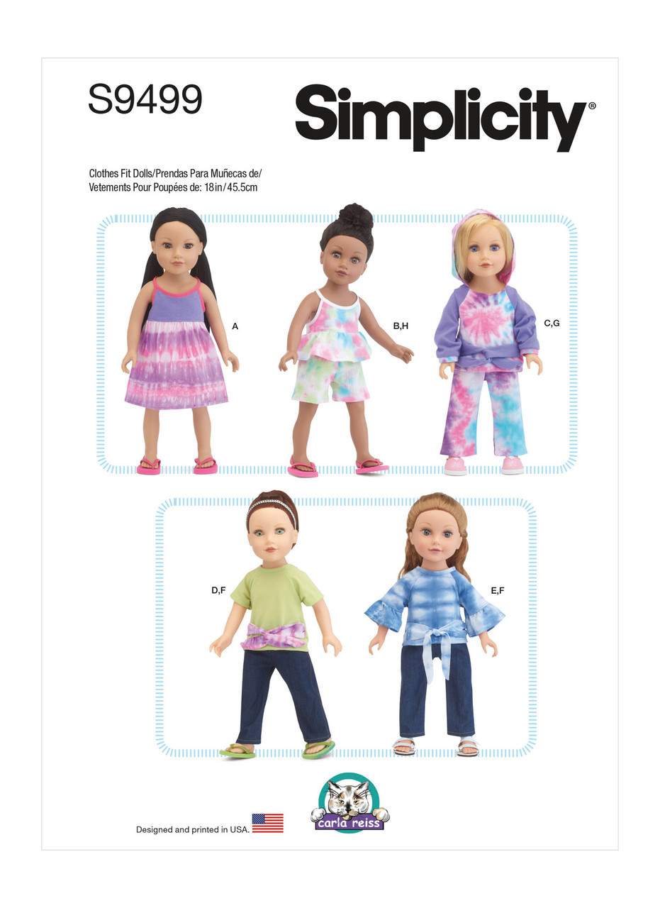 Dress and fluttery tank have hook and loop tape closure and contrast bias tape binding and shoulder straps. Knit hoodie, tee and top have twist and tie details at the waist and back hook and loop tape closures. Jeans have stitching details, back opening and front faux button. Pull on pants and shorts have elastic waist. Give these mix and match pieces a fun twist by tie dyeing the fabric beforehand!