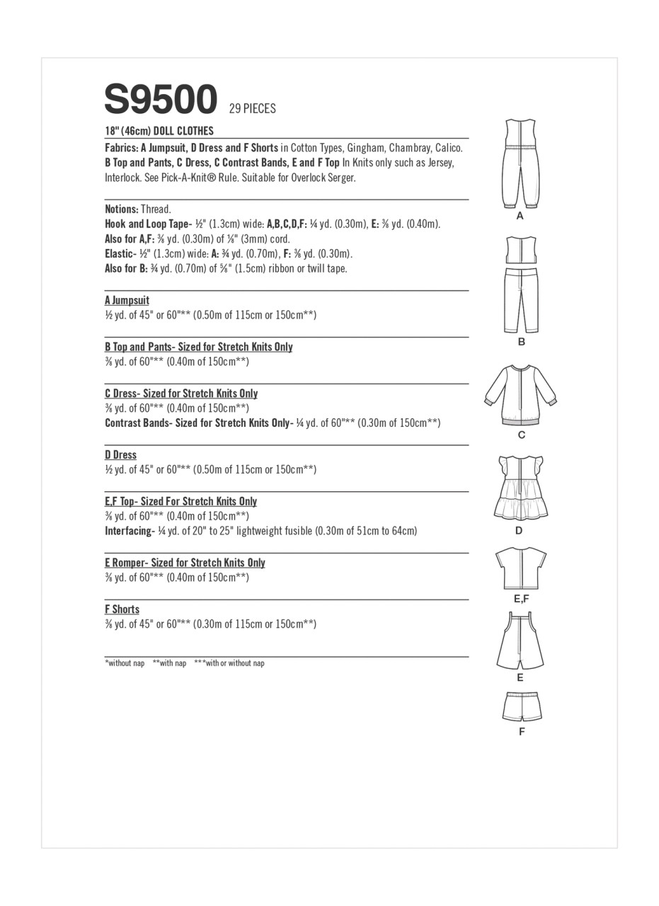 Modern wardrobe for 18" dolls have back hook and loop tape closures. Sleeveless jumpsuit has elasticized waist and ankles; knit athleisure crop top and leggings have ribbon striping. Knit mini sweatshirt dress has rib knit bands. Dress has tiered skirt and shoulder ruffles. Knit tee has round neck and is worn with shorts romper or pull on shorts with working pockets and elastic waist. Cute!