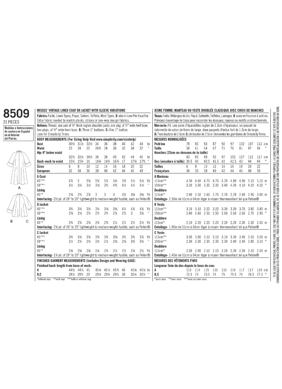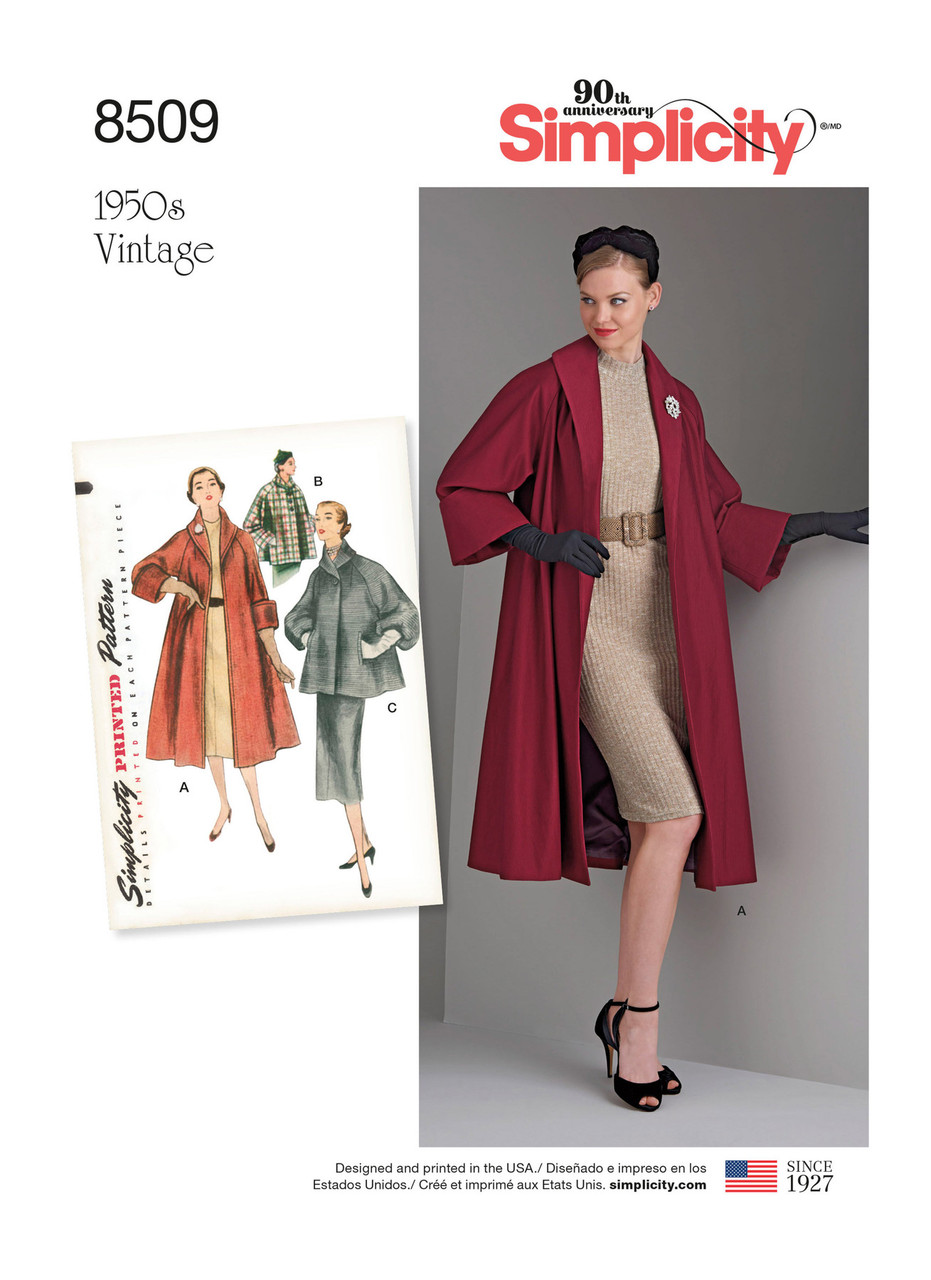 A shawl collar style all views. Top-stitching trim is optional. Coat, view A has three-quarter length raglan sleeves with turn back cuffs. Topper, View B has long raglan sleeves with turn back cuffs. Welt pockets trim Views B and C. View C closes with one button at neck and has a band at lower edge of the one-piece raglan sleeves. Simplicity authentic vintage sewing pattern circa 1950.