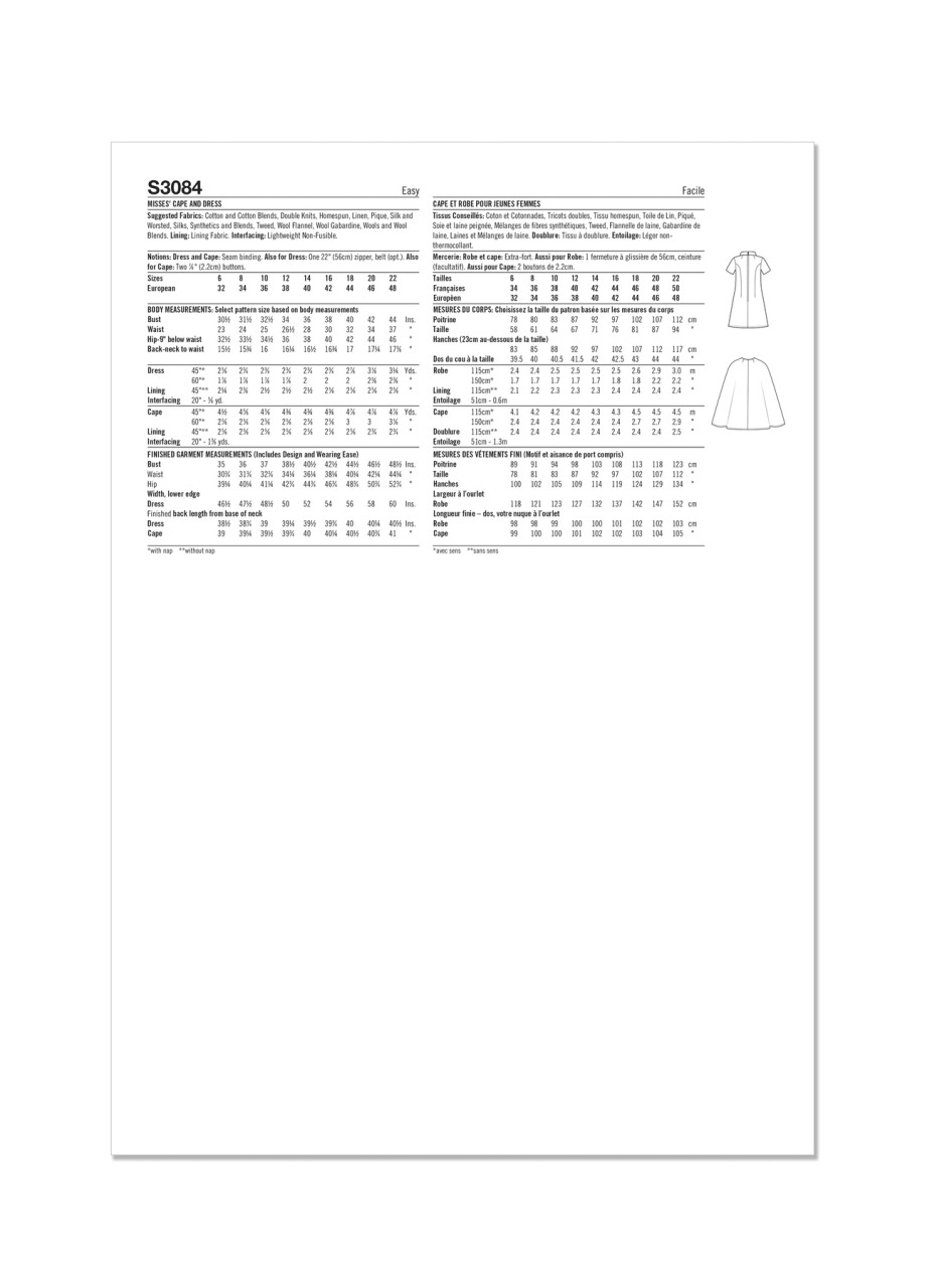 Vintage Simplicity 1960's cape and dress sewing pattern. The lined dress with dart interest has back zipper, roll collar, patch pockets, short set-in sleeves and optional top-stitching and purchased belt. The lined cape with optional top-stitching features shaped front opening fastened with buttons and buttonholes. Authentic Vintage Reproduction includes additional sizes and cutting layouts.