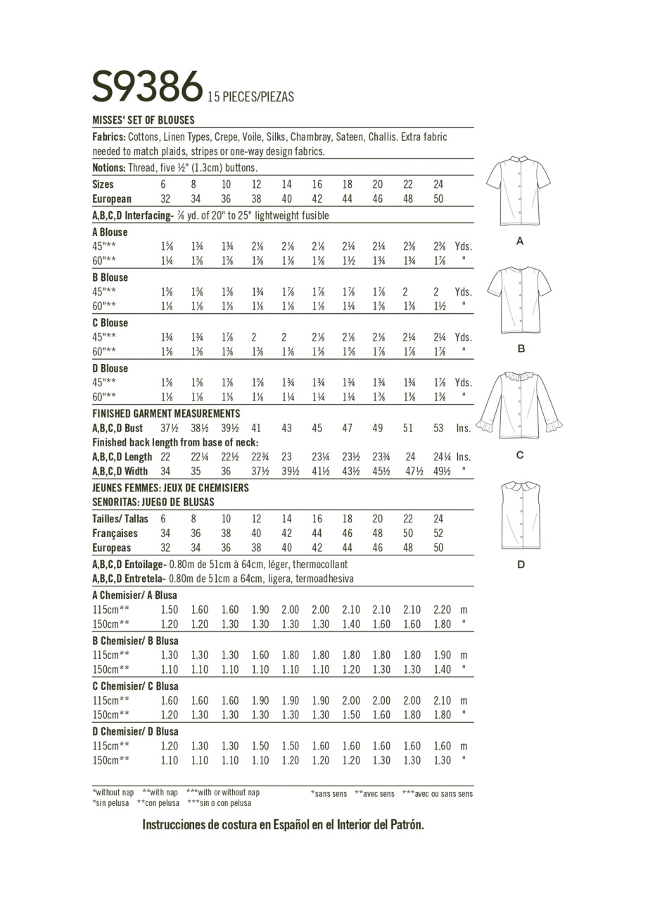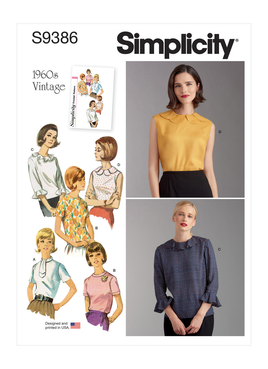Set of blouses have high round neck, darts, back button closure, set-in sleeves with tie, ruffle and sleeve variations. True vintage pattern offering looks of the early 60's.
