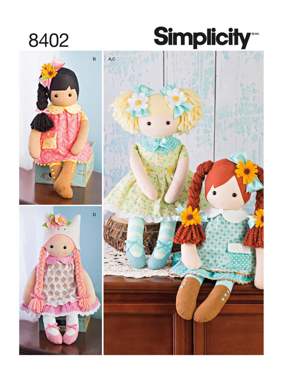 Sew these adorable 23" stuffed dolls with clothing in four styles. Pattern features yarn hair and different dress styles with trim details. Make fabric boots or ballet slippers, and give your doll a hat or bows with flowers. Elaine Heigl for Simplicity.