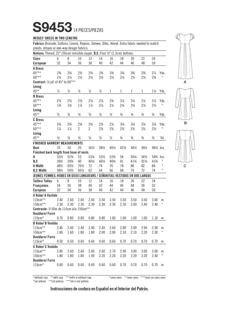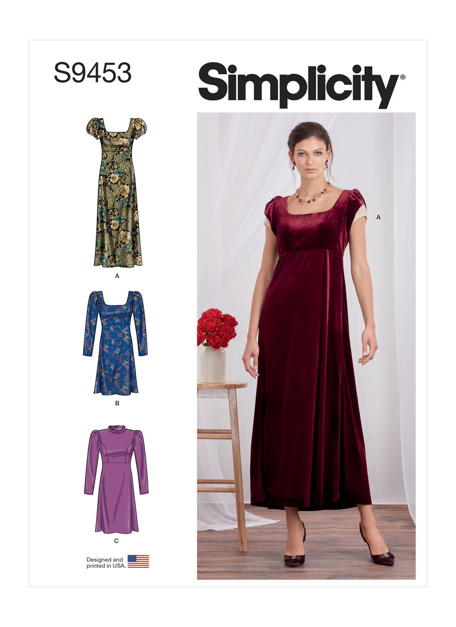 A-line empire dress in two lengths has low shaped neckline or high ruffled neck. Tulip shaped, short puff and long puffed sleeve options included.… Read More