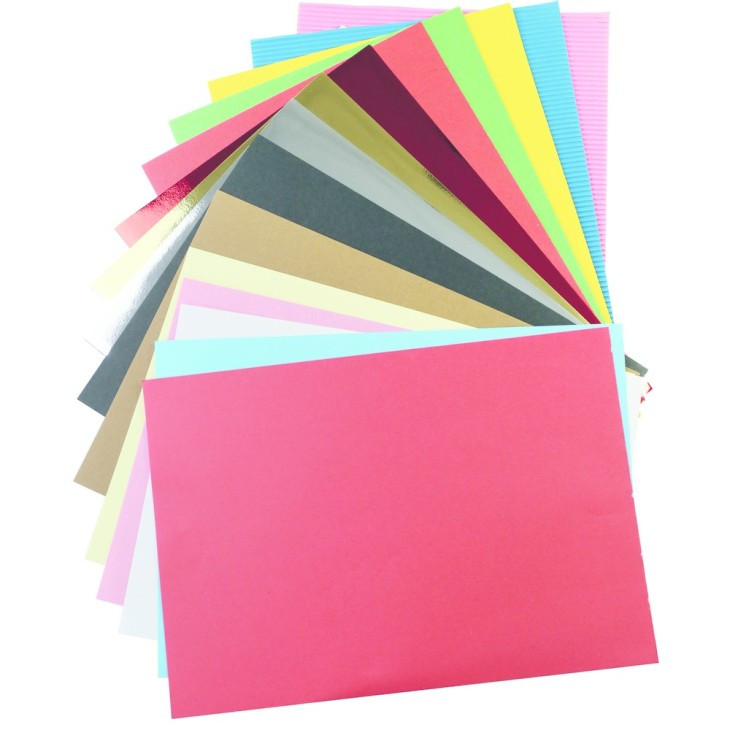 A block of papers in different colours and materials, perfect for creating many original creative projects. This multi-activity block contains 15 assorted sheets of coloured paper in A4 format (21x29.7cm). The assortment contains: 4 sheets of 80g/m² coloured paper (pink, white, blue and red) and 3 sheets of 160g/m² coloured paper (black, brown and yellow) 2 sheets of corrugated cardboard (pink and blue) and 3 sheets of 120g/m² material paper (red, green and yellow) 3 sheets of 125g/m² metallic paper (gold, silver and red).