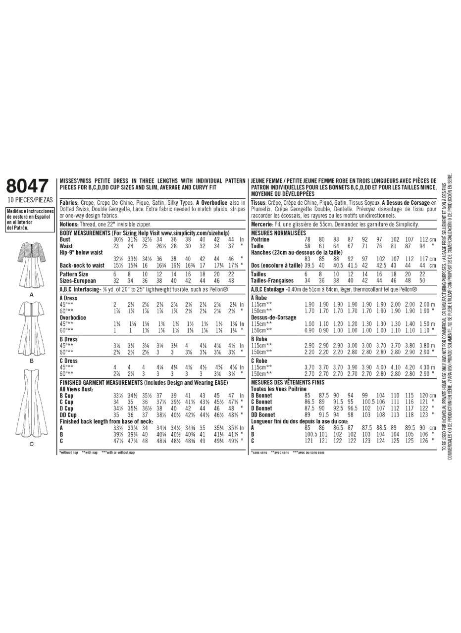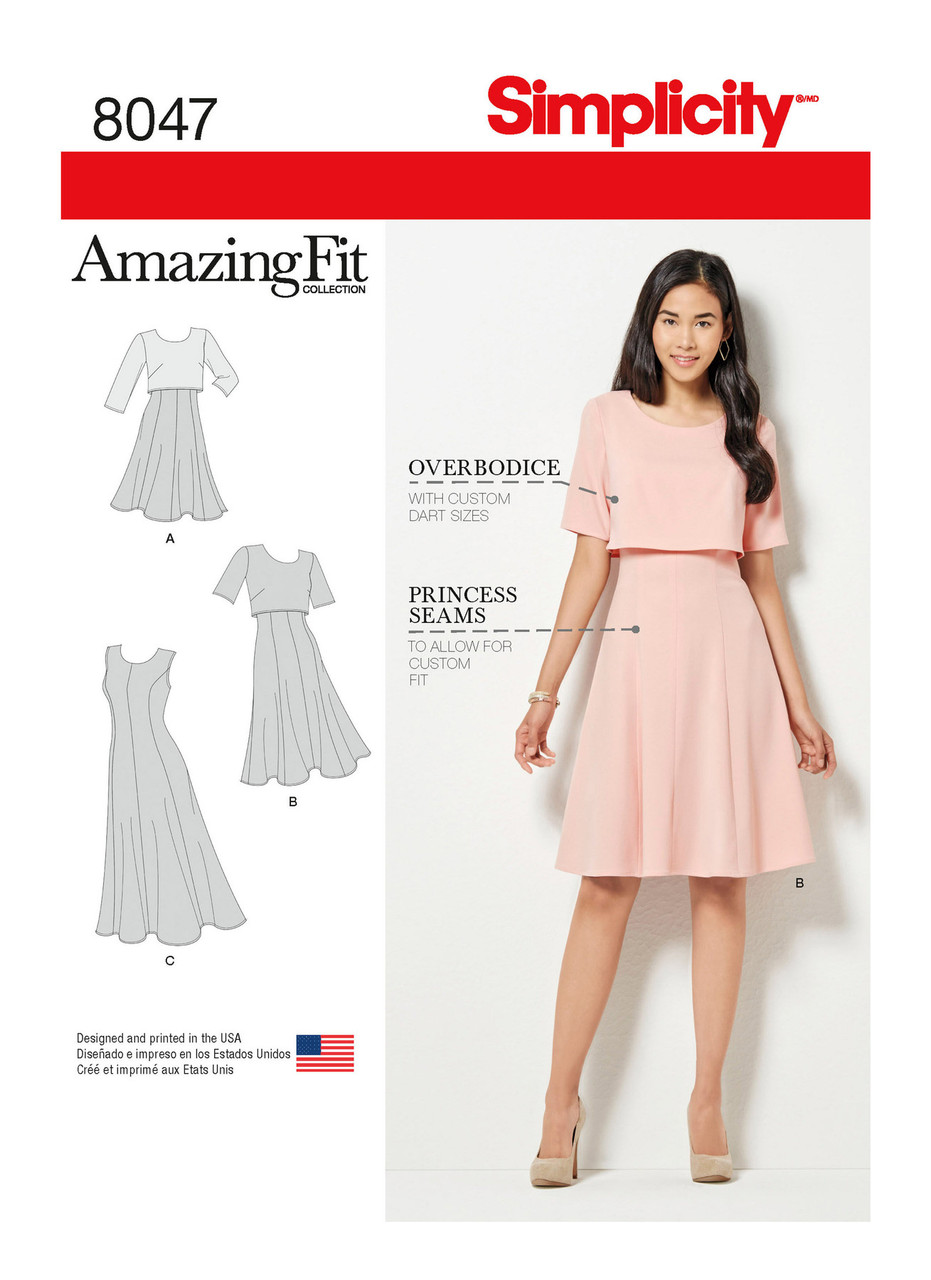 Women's or Petite dress with pattern pieces for B, C, D, DD cup sizes in three lengths has sleeve variations & optional popover which can be made in contrasting or self fabric. Amazing Fit Collection by Simplicity