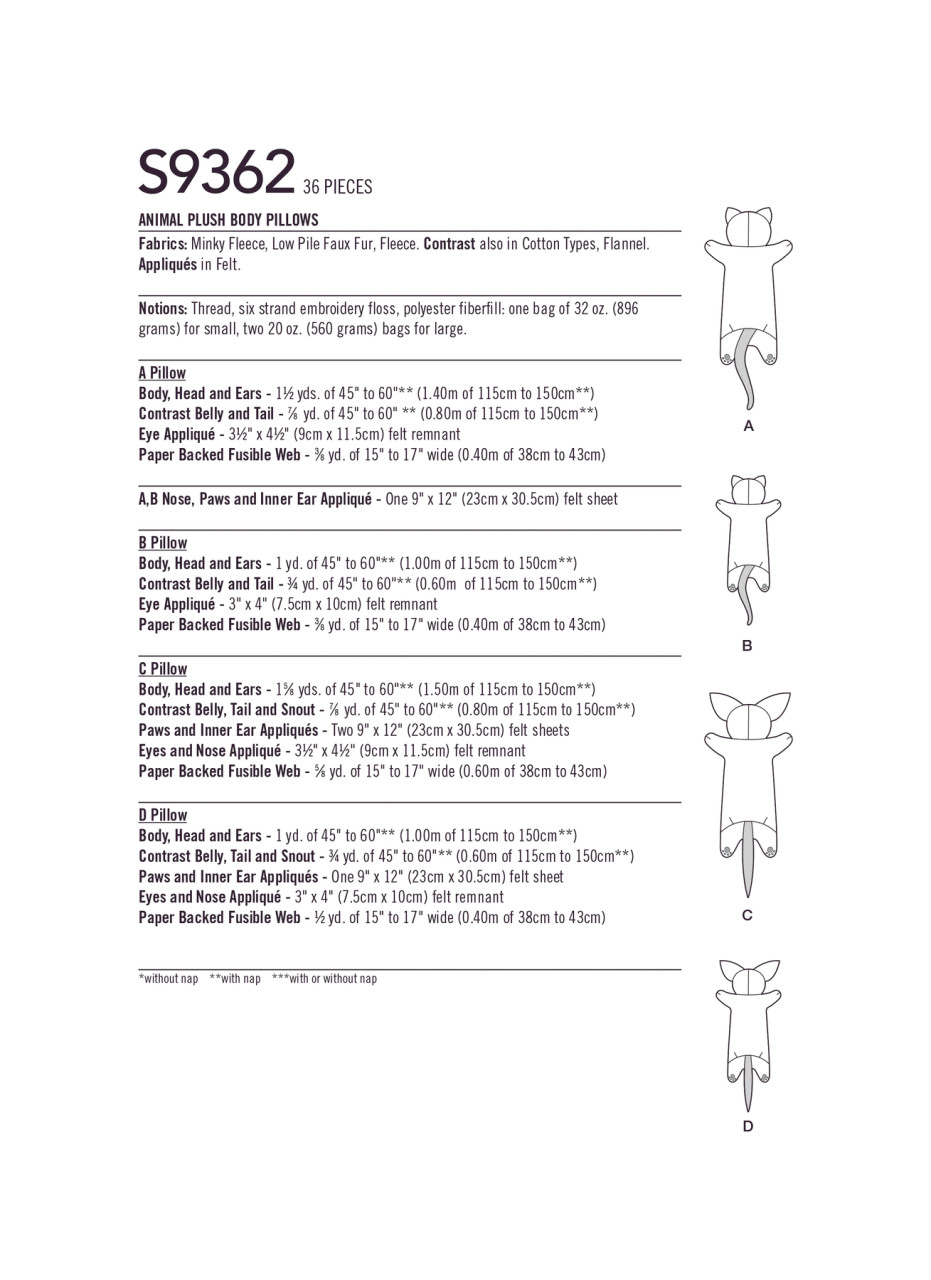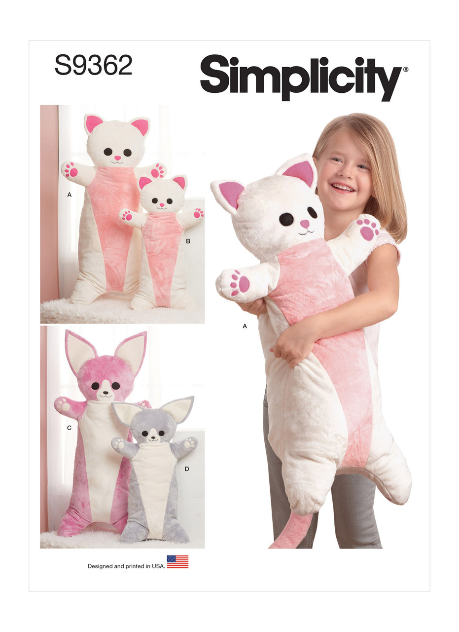 Cuddly kitty and chihuahua body pillows have huggable cylinder-shaped bodies with contrast bellies, easy to sew sculpted arms and legs and softly stuffed tails. Large pillows measure 36" long, small pillows measure 24" long. Facial features and paws are appliques cut from craft felt and hand embroidered mouths.