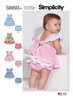 Babies’ Pinafore-style dresses with back button fastening or tie. Trim variations. Bloomer-style panties with optional frill trim.