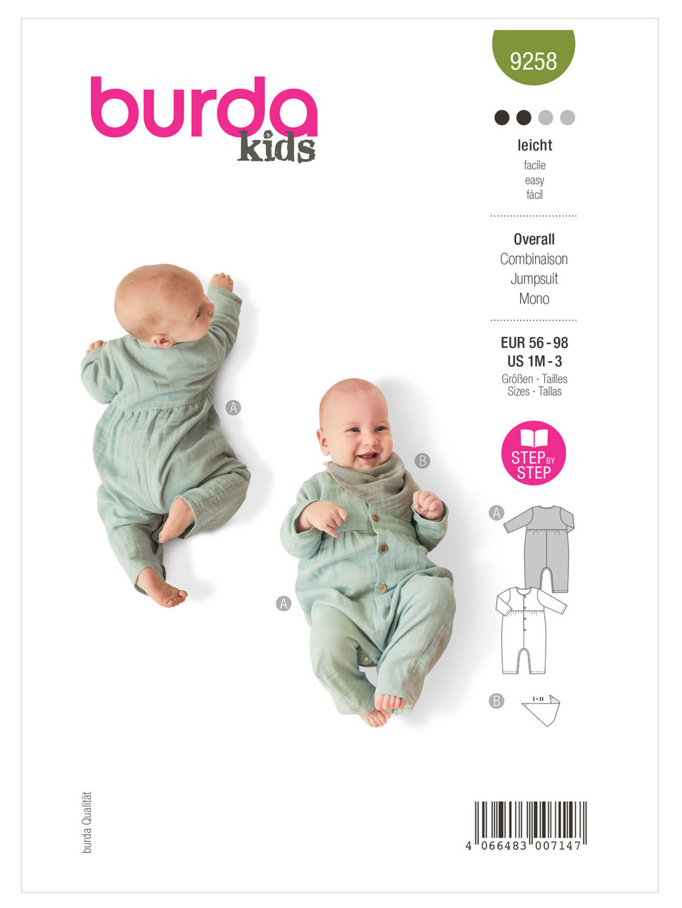 Super practical and comfy, your baby will be all bundled up in this wonderful little romper with an inside leg fastening. The triangular scarf is an indispensable finishing touch. It can be sewn of leftover fabric and would be appreciated on its own by new moms and dads.