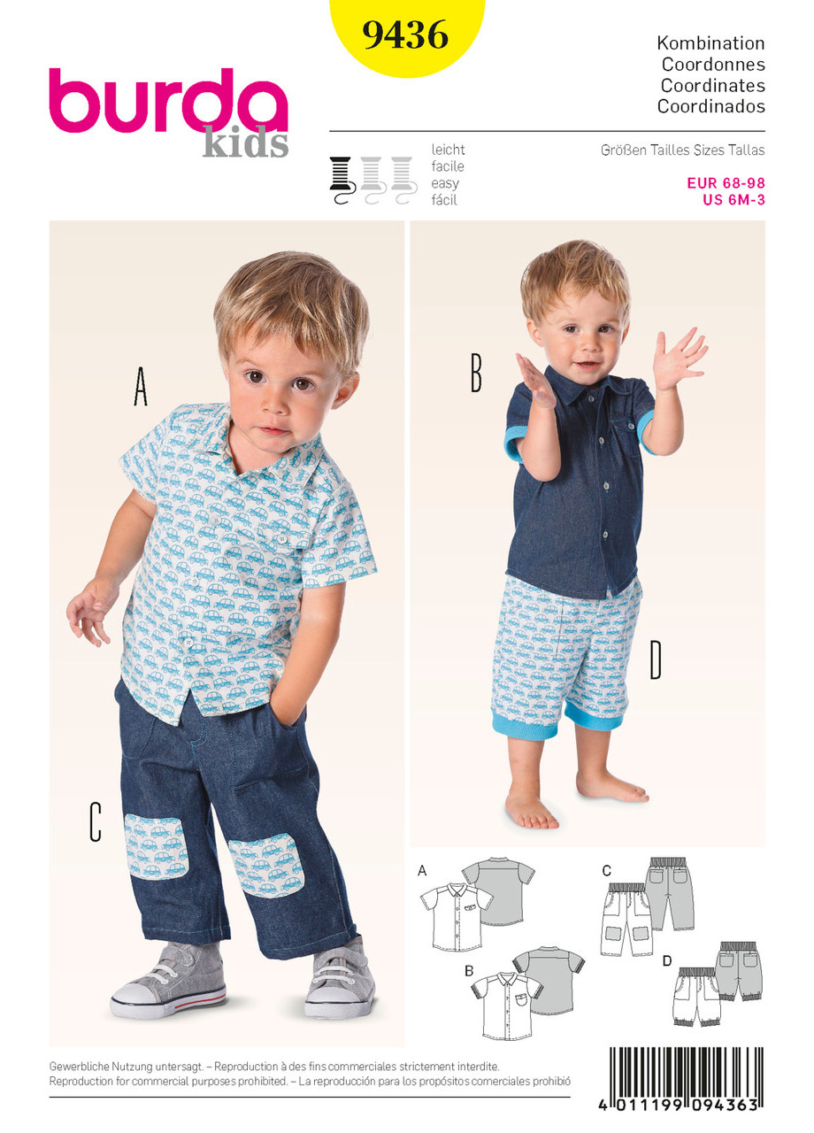 Airy summer outfits for little boys. Short-sleeved shirt with yoke, to be adorned with ribbed bands, if you like. Matching super comfortable Trousers with patch pockets and rib knit waistband.