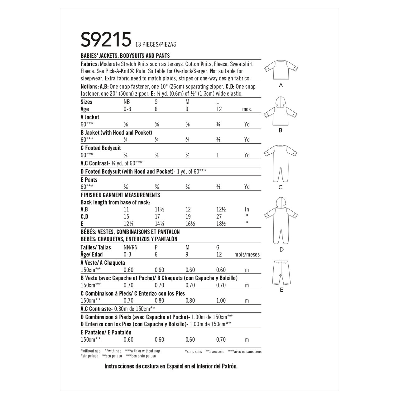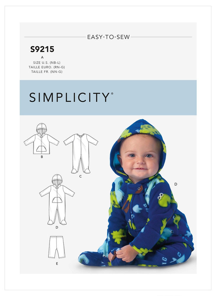 Unlined jackets & bodysuits with mitt & hood variations & kangaroo pocket variations, elastic waist pants.