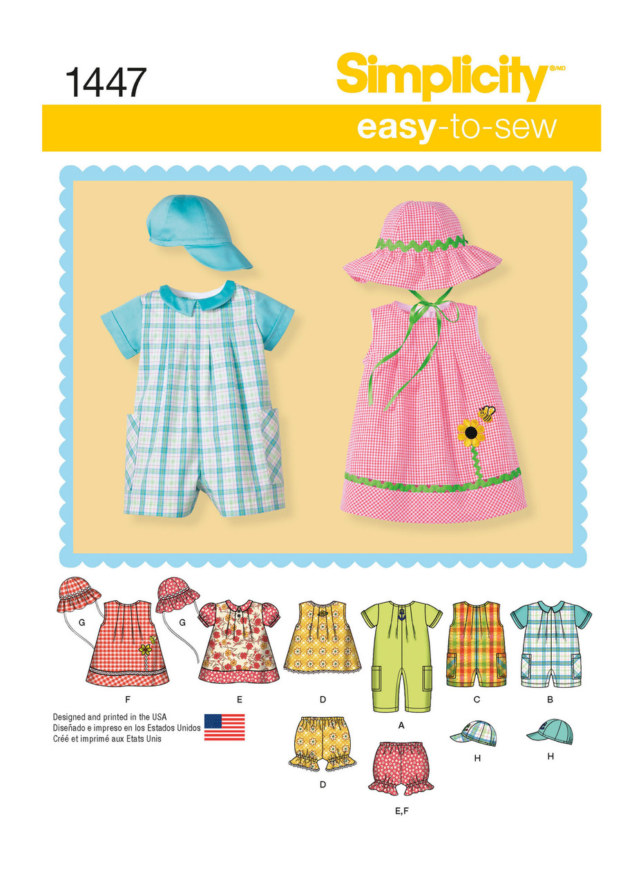 Babies' Separates include a short & long romper with side pockets, a sleeveless dress with trim & applique, a short sleeved dress with collar, panties, sunhat & baseball cap both in three sizes. S (17"), M (18"), L (19").