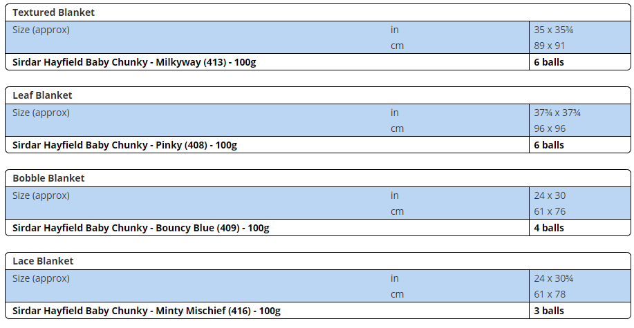 This leaflet includes four blankets to knit - a textured blanket (shown in tan), a leaf blanket (shown in pink), a bobble blanket (shown in blue) and a lace blanket (shown in green).