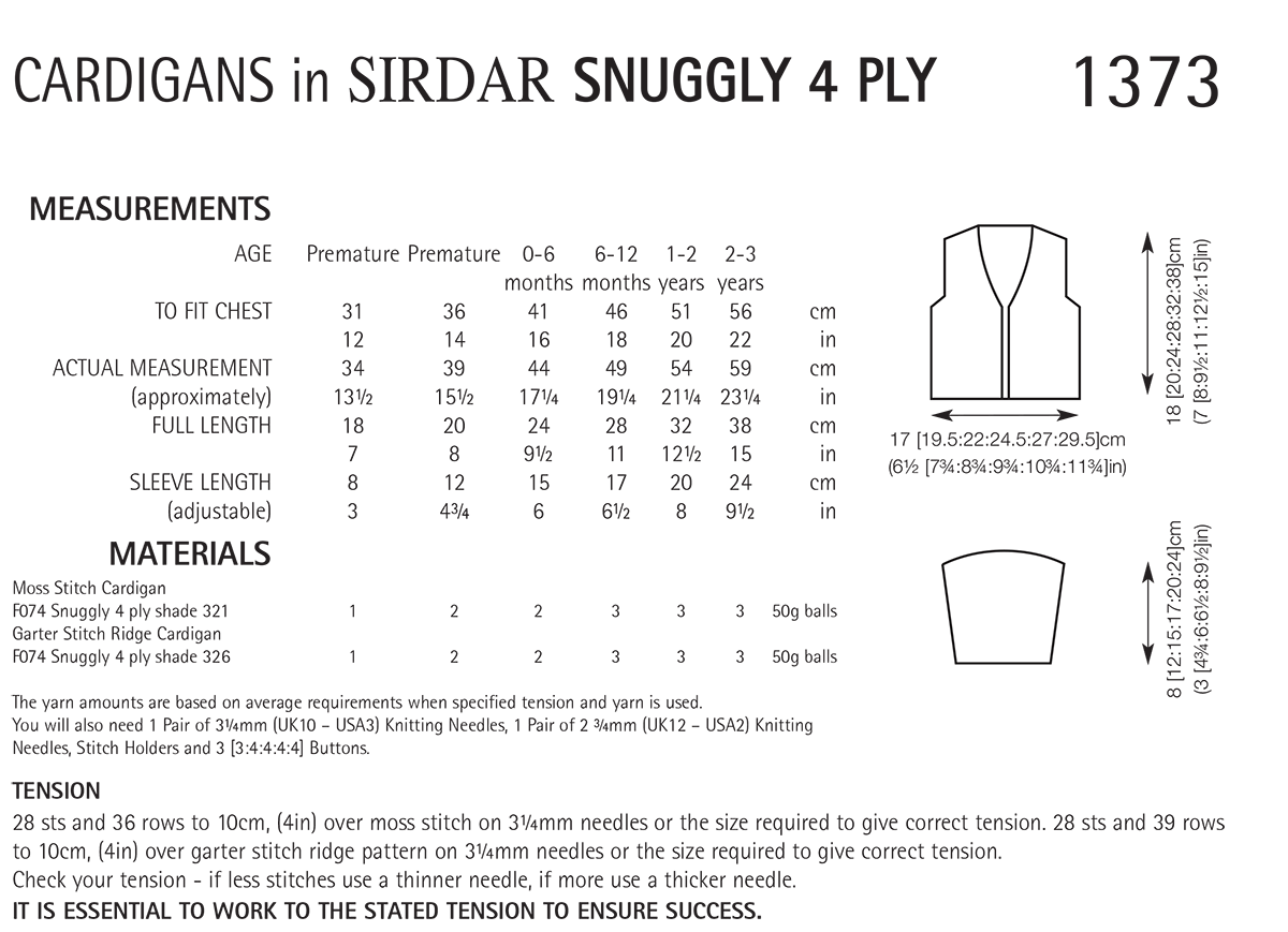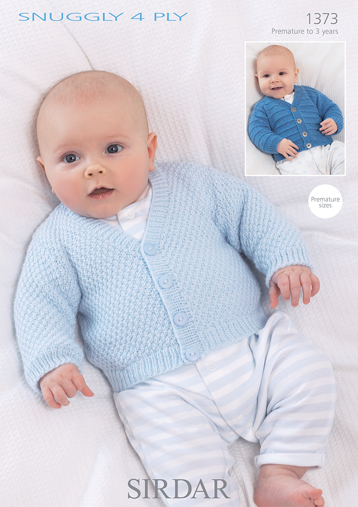 Cosy textured cardigans knitted in gentle Sirdar Snuggly 4 Ply finished with rib trims, using simple knit and purl stitches to create beautiful textures. You can knit these sweet baby cardigans in sizes from premature baby to toddler.