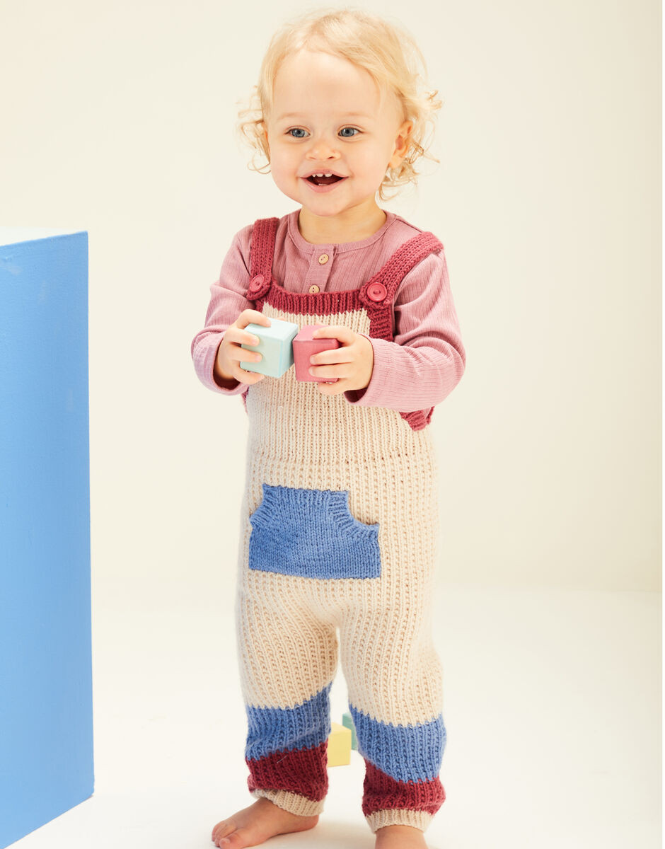 These sweet colour block dungarees are perfect for baby playtime and feature button fastenings for quick changes! A cute design from our Building Blocks collection of baby knitting patterns, the textured stitch and shaping make this an interesting project for more confident knitters.