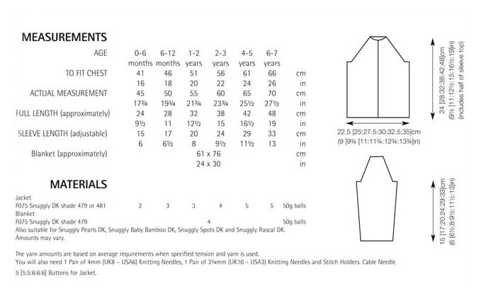 You will also need: Single Point Needles 3.25mm (USA 3), Single Point Needles 4mm (USA 6), a cable needle, stitch holders and 5 [5:5:6:6:6] Buttons for Jacket.
