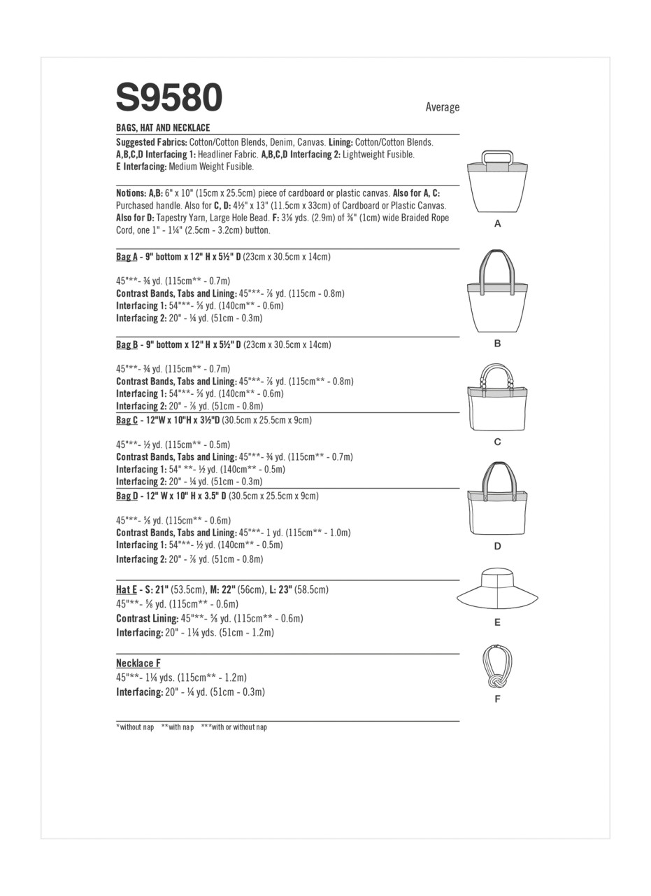 Bags come in two shapes and sizes. Views A and C have purchased handles and views B and D have fabric handles. Hat in three sizes has a wide brim. Kno… Read More