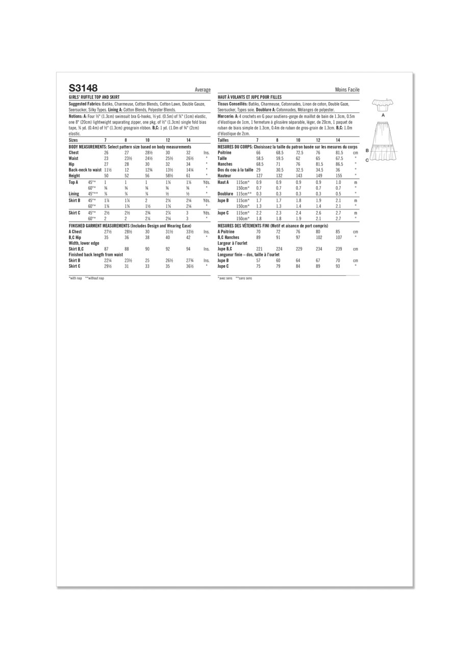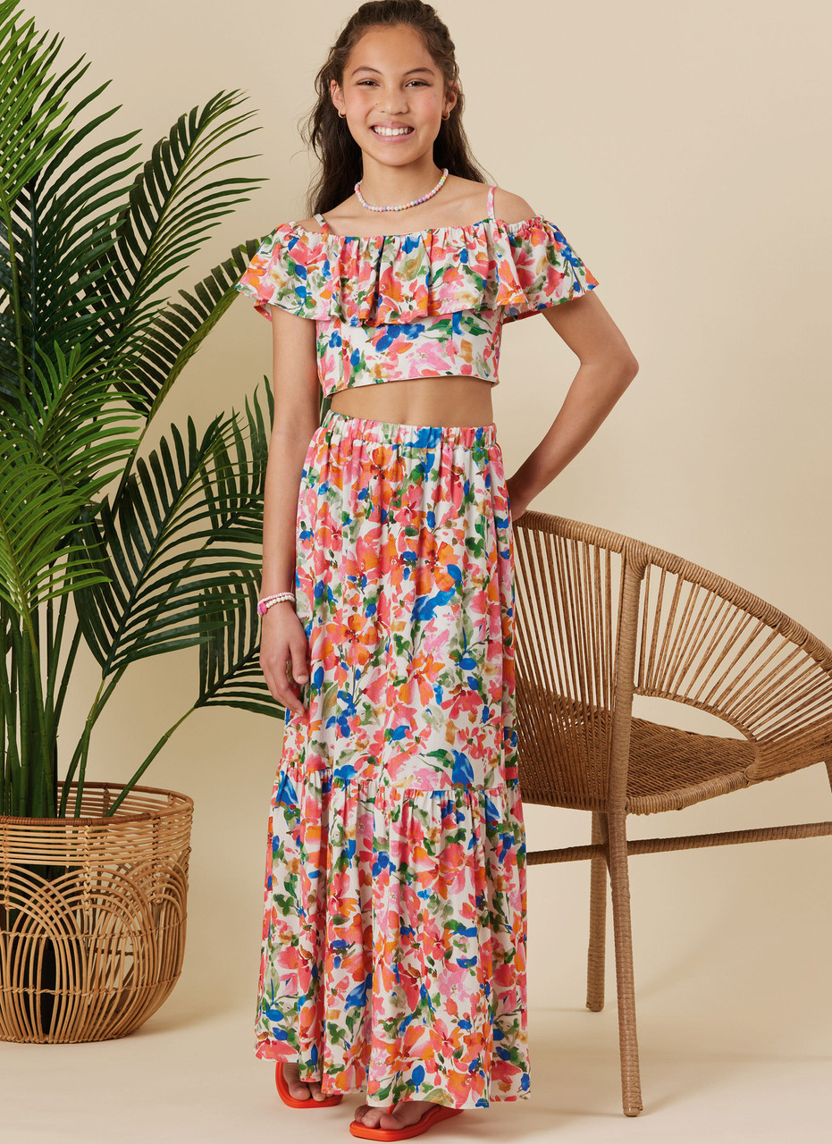 Girls' off the shoulder top has princess seams and ruffle neckline with or without spaghetti straps. Midi or ankle length skirt has elastic waistband and gathered ruffle hem.
