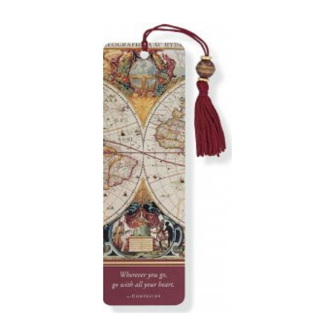 - Antique map design features gold foil accents and complementary silky burgundy tassel, and burgundy and gold beads.