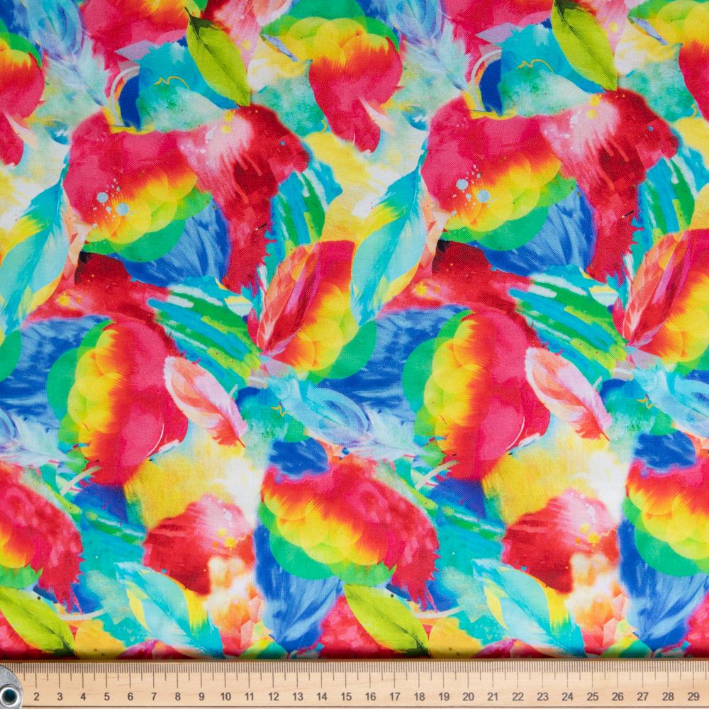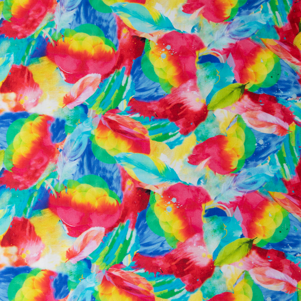 An abstract array of tropical birds and feathers in rainbow hues. Beautiful, high quality, printed cotton fabric. Ideal for quilting, masks, crafts, displays, table decoration and as a dressmaking fabric.