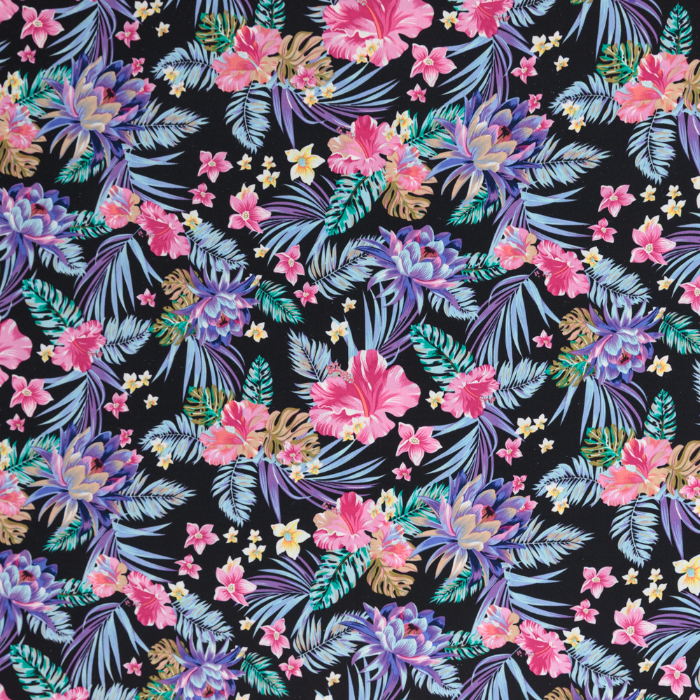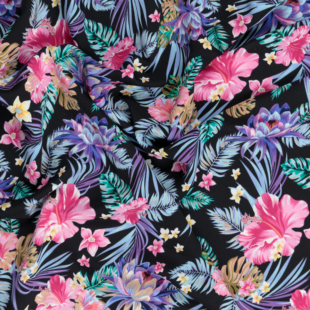 Bring a garden to your wardrobe with this Black Multi Floral Polyester Crepe. Scattered with painterly florals in vibrant hues, this lightweight crepe offers a fluid drape and a softly textured hand with a hint of dry crispness. Wrinkle-resistant and opaque, it's a dream for travel and warm-weather wear. Think tea dresses that flutter in the breeze, blousy wrap tops, wide-leg high-waisted trousers, playsuits, and jumpsuits that balance ease with elegance. A summer staple with staying power.