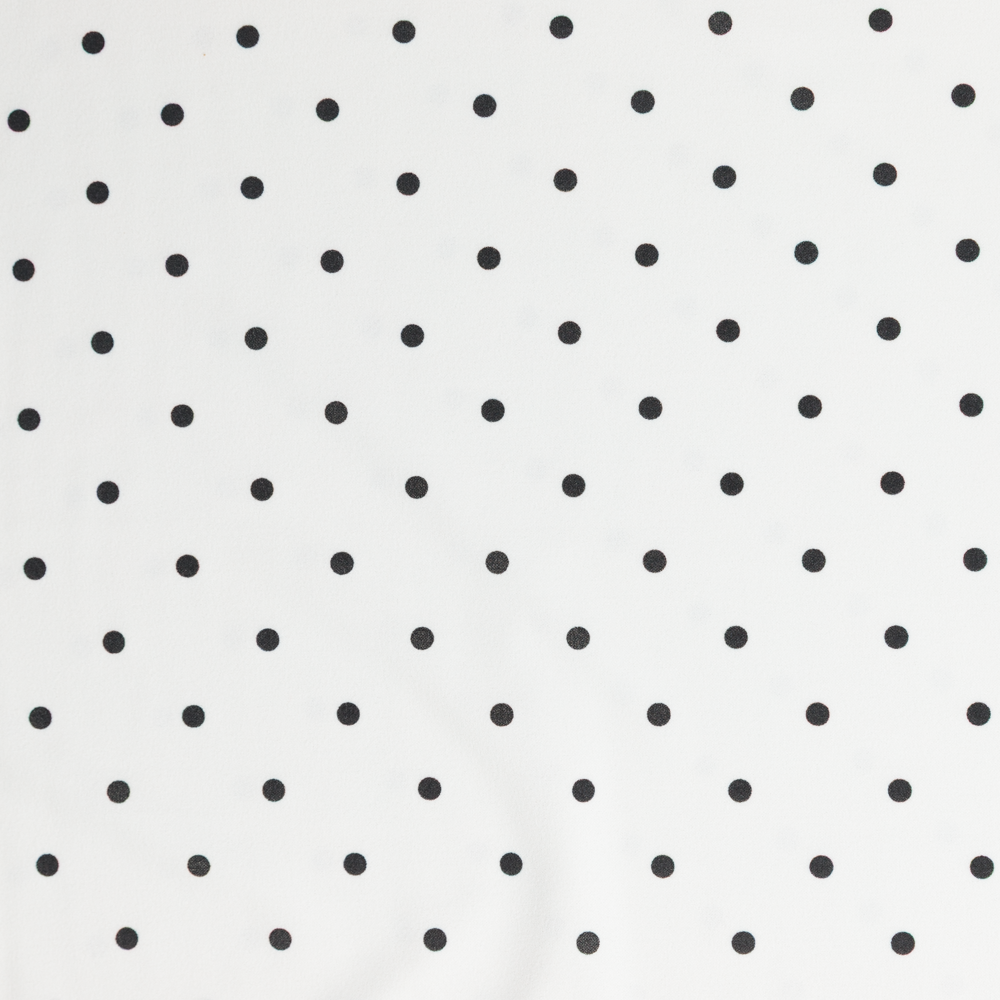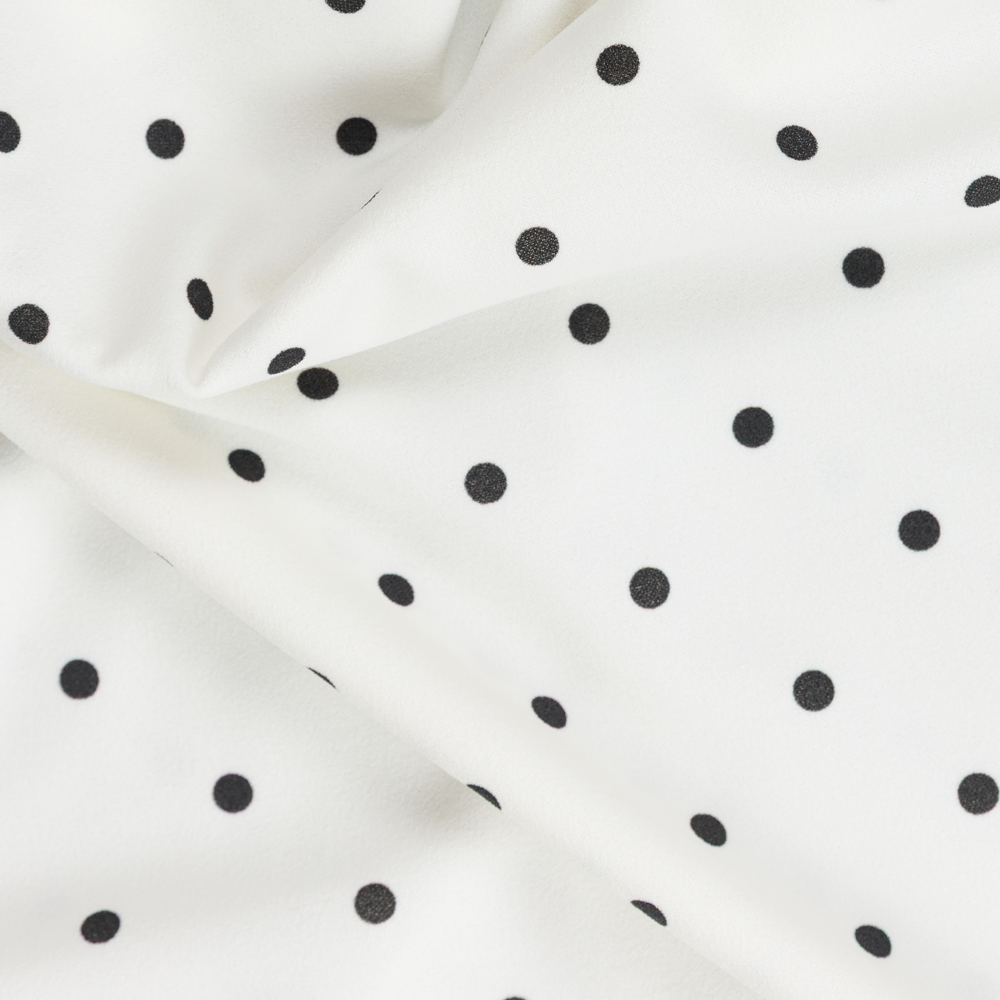 Polka dots, but make it fluid. This Black Polka Dot Polyester Crepe is a modern take on a timeless classic, bringing a playful print to a fabric that flows like water. Translucent and lightweight, it stretches generously across the width (with 30% stretch lengthwise too), offering comfort with movement. With its softly textured hand and fluttery drape, it's made for wrap dresses, ruffled blouses, sheer layering tops, and flared midi skirts. Whether you're channeling retro romance or building a capsule wardrobe with a twist, this crepe is a versatile pick. Add a lining when opacity is needed—or embrace its airy nature for light, layered looks.
