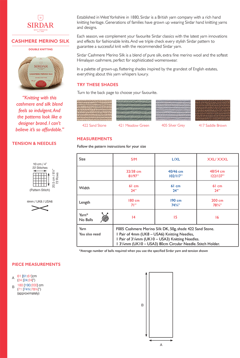 1 Pair of 4mm (UK8 – USA6) Knitting Needles, 1 Pair of 3.25mm (UK10 – USA3) Knitting Needles. 1 80cm, (UK10 – USA3) Circular Needle. Stitch Holder.