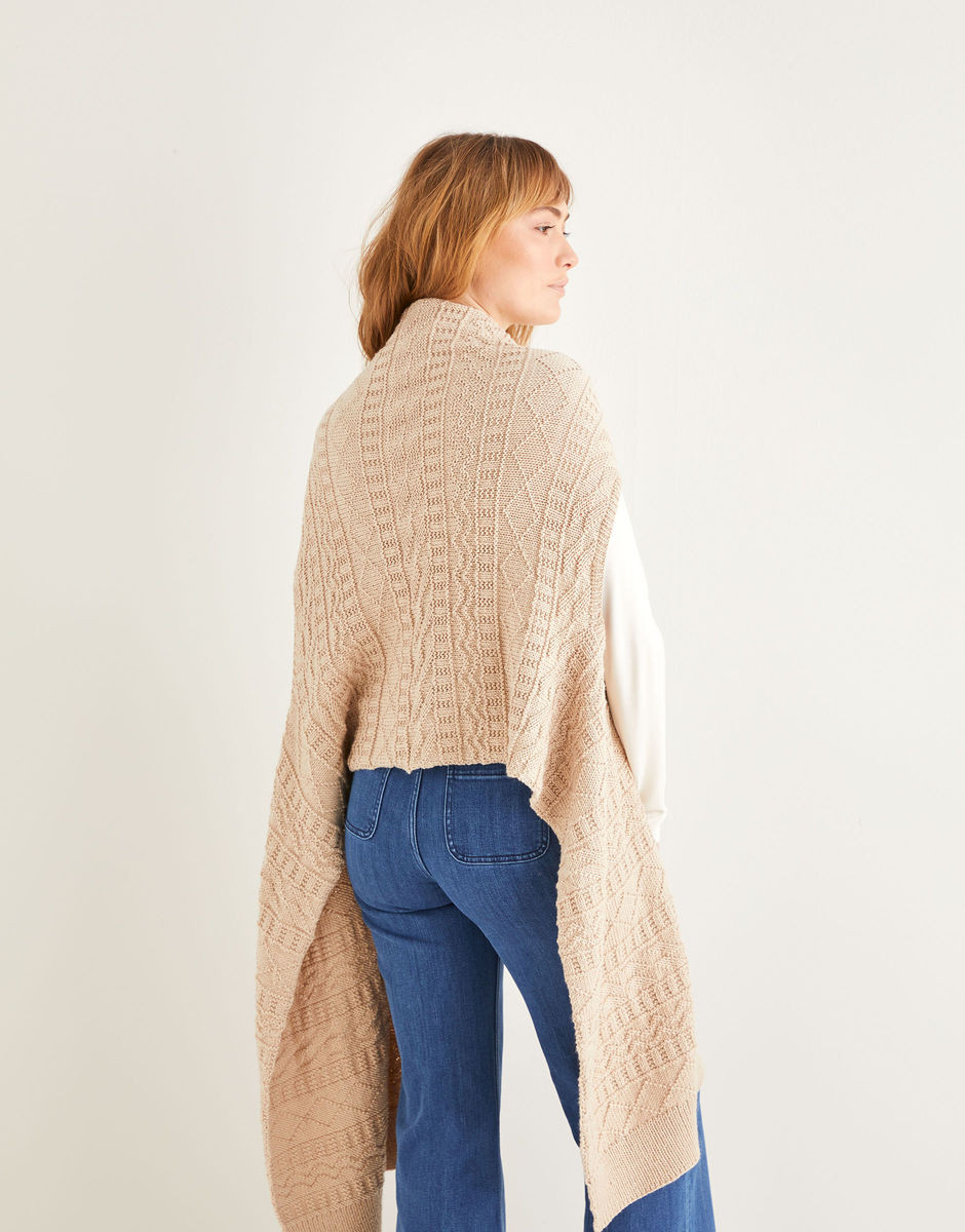 With more than a little pioneer spirit and inspired by native American patterns and textures, our Blanket Style Wrap is knitted in one piece, with armholes integrated within the seamless panel.