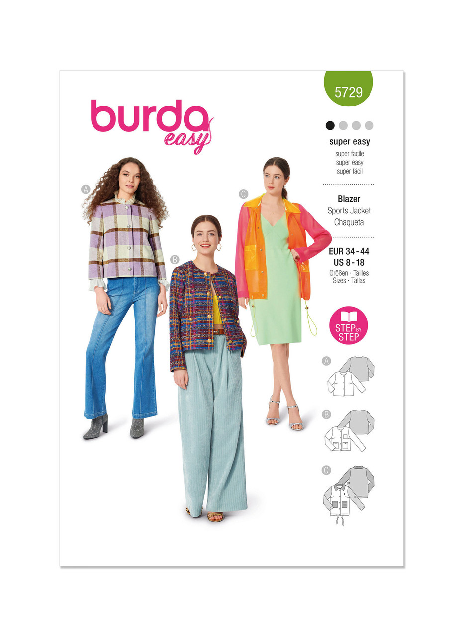 Create your perfect blazer with this versatile Burda easy pattern! Choose from three options: a classic bouclé blazer with gold buttons, a casual flannel jacket in grunge style, or a cool mix of mesh and PVC. Perfect for beginners looking to make a stylish statement in spring and summer. Let your creativity run free and design your new favorite piece!