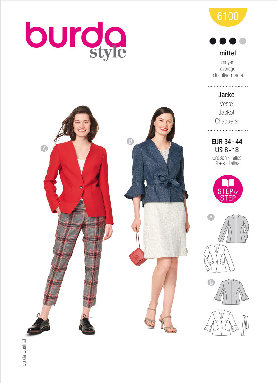 If you find the lines of a classic blazer too harsh, you will love this chic lined jacket with integral collar and a slight V-neckline. The seams create an interesting effect and you can include pockets if you like. This garment will require some sewing experience, however. The shorter, more feminine version with sleeve flounces is also pleasing.
