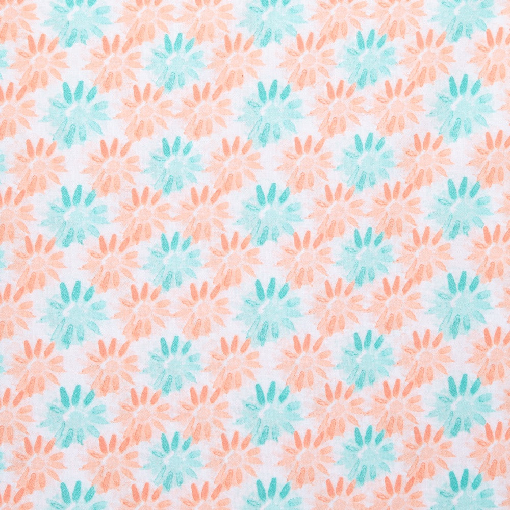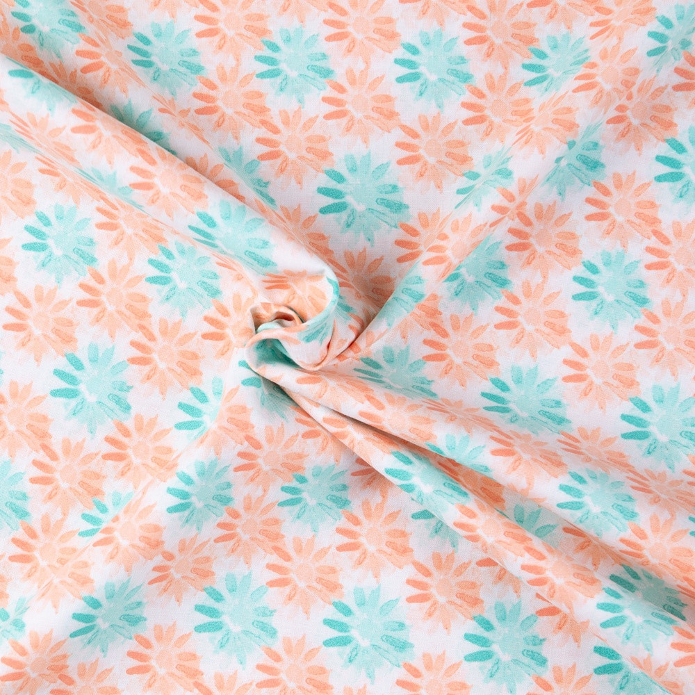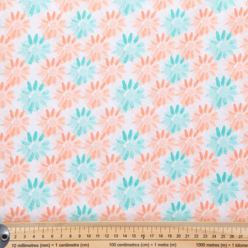 Watercolour floral in turquoise and coral. Beautiful, high quality, printed cotton fabric. Ideal for quilting, masks, crafts, displays, table decoration and as a dressmaking fabric.