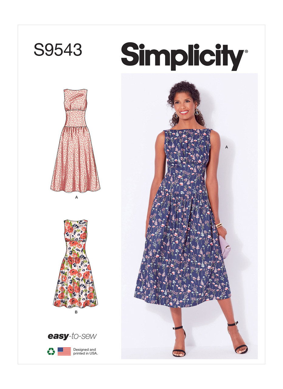 Midi or knee length dresses have front boat neckline to gathered shoulder straps at back, fitted drop waist with optional decorative top stitching and gathered skirt in two lengths. Front bodices are lined.