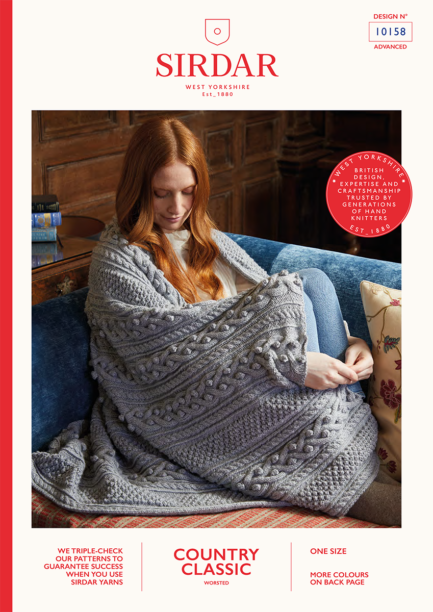 Add an elegant, textured look to your home and an extra layer of warmth on chilly nights with this cosy blanket in Sirdar Country Classic Worsted. Inspired by an English stately home, the intricate trinity, cable and rib and bobble and twine stitches would suit an advanced knitter.