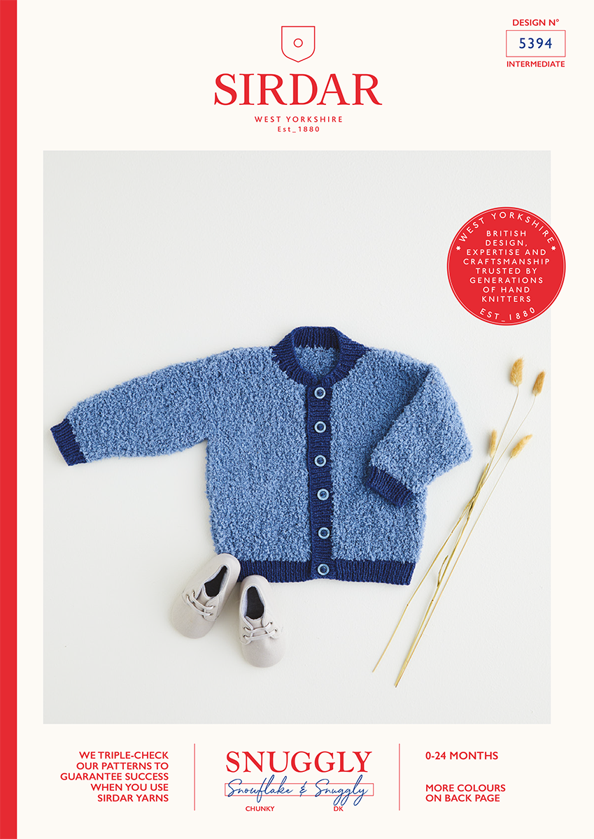 A fluffy bomber jacket in Snuggly Snowflake Chunky to keep your little one cosy this season. The contrasting ribbed placket, neckline and trims are in Snuggly DK.