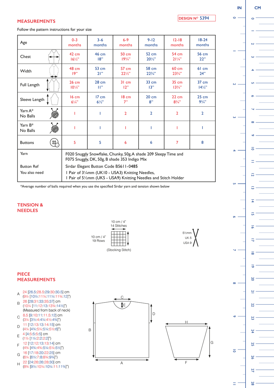 1 Pair of 3¼mm (UK10 - USA3) Knitting Needles, 1 Pair of 5½mm (UK5 - USA9) Knitting Needles and Stitch Holders. 5 [5:6:6:7:8] buttons.