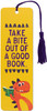 A mischievous orange dinosaur chows down on a green tome on this fun bookmark.