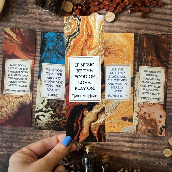 The Twelfth Night bookmark features a line of passion, wit, and wisdom from the Bard, encased in colourful marble illustration.