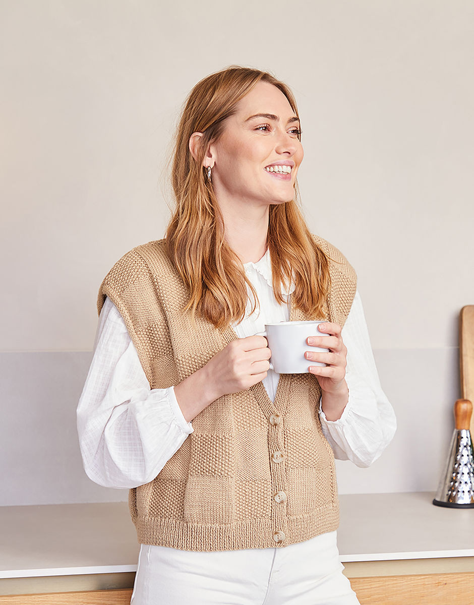 Create the chequerboard pattern of this boxy waistcoat with moss stitch and stocking stitch then finish with classic tortoiseshell effect buttons for a fashionable Annie Hall vibe. Perfect for showing off the sleeves of a pretty blouse on smart-casual working from home days.