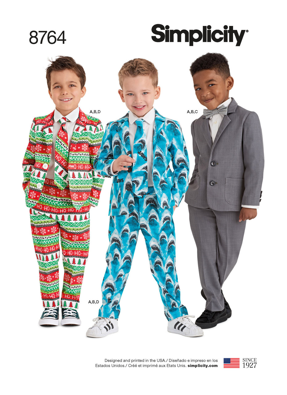 Alternate this pattern according to any special occasion, holiday, or crazy theme. Boy’s skinny suit includes a smart jacket, slim Trousers, bow tie, and classic tie. The jacket does up with two buttons and has two functional pockets in the front. Trousers with front pleats and one hook zipper closure. Simplicity sewing pattern.