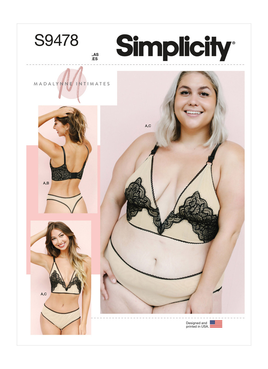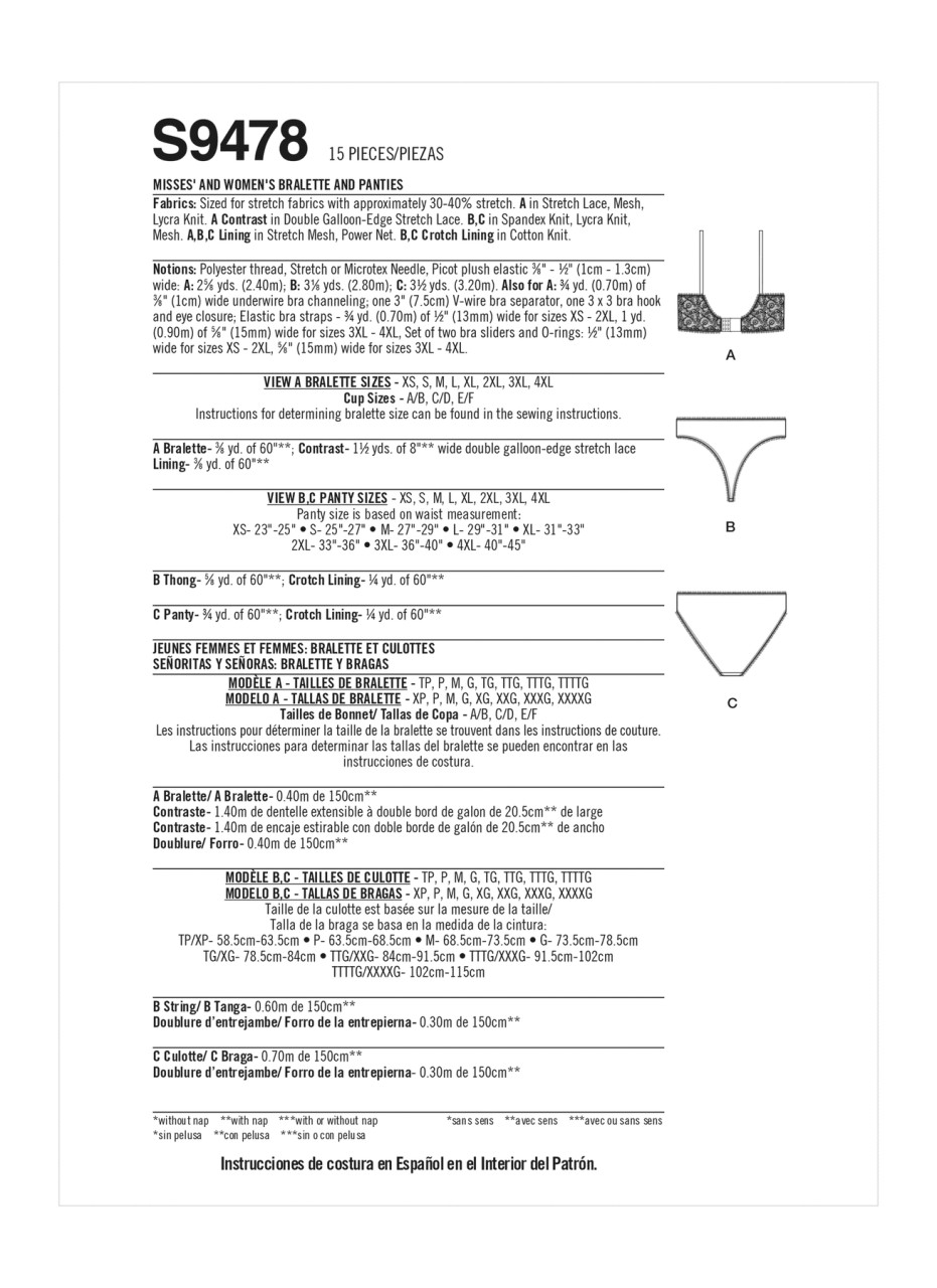 Bralette with adjustable shoulder straps, underwires, back bra hook closure and stretch lace details fits cup sizes A through H. Thong or full coverage panties with elastic edging and cotton crotch lining come in sizes XS through 4XL. Pretty and comfortable - ready to be custom made to fit you! See envelope for more information.