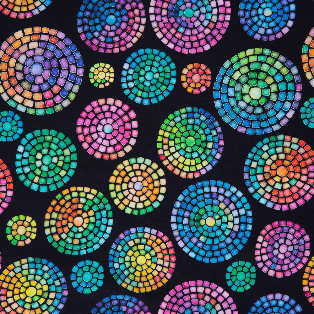 A batik-style, multicoloured mosaic tile pattern on a black background. Beautiful, high quality, printed cotton fabric. Ideal for quilting, masks, crafts, displays, table decoration and as a dressmaking fabric.