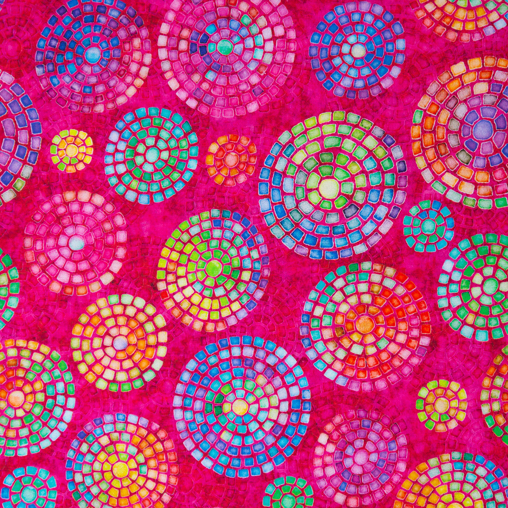 A batik-style, multicoloured mosaic tile pattern on a hot pink background. Beautiful, high quality, printed cotton fabric. Ideal for quilting, masks, crafts, displays, table decoration and as a dressmaking fabric.